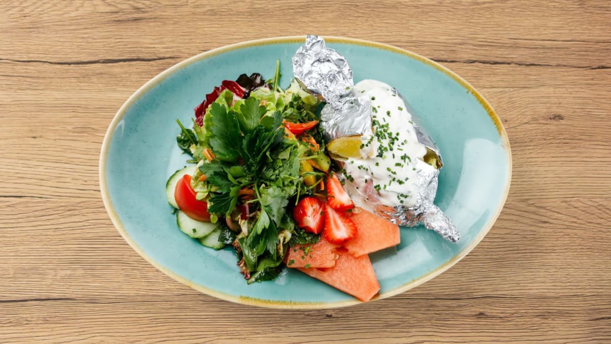 mit Sauerrahm, Schnittlauch und Beilagensalat