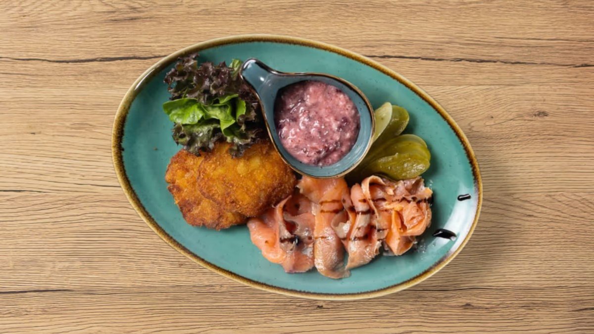 Räucherlachs, Kartoffelrösti, Senf-Honig-Dip