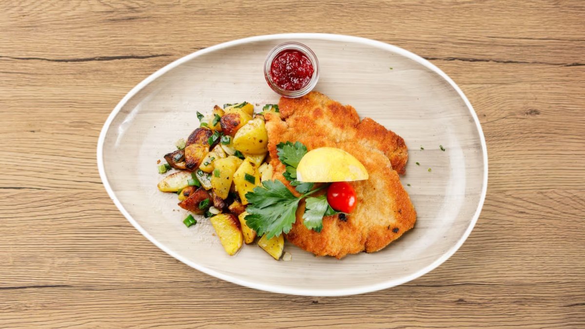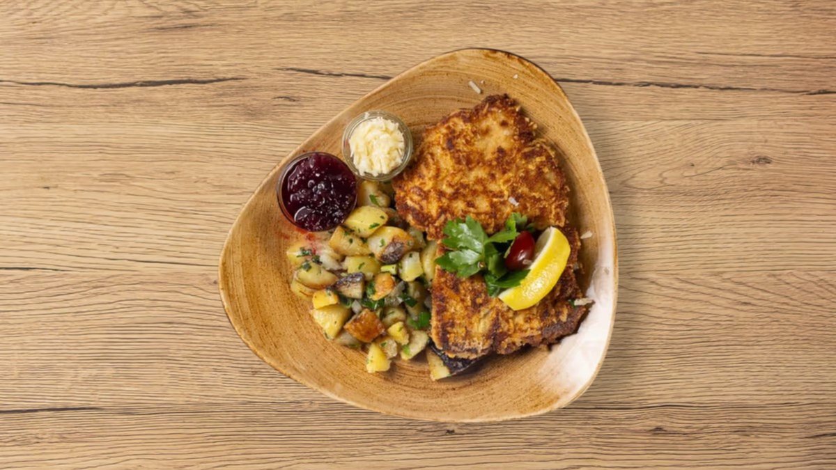 klassischer Panade, Wildpreiselbeeren, Pommes frites oder Bratkartoffeln