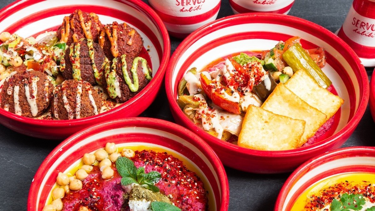 alle Gerichte werden mit Hummus, gegrilltem Gemüse und Kichererbsen-Salat serviert