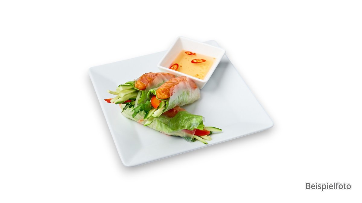 2 Stück Reispapierrollen mit Reisnudeln, Salat, Mango, vietnamesischen Kräutern, Hoisin-Soße und Erdnüssen