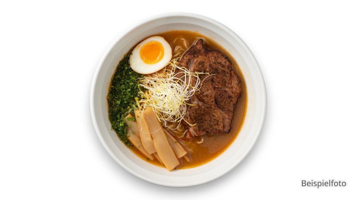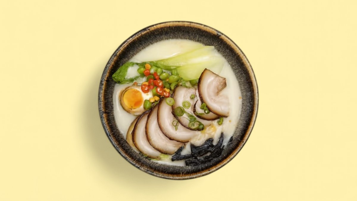 mit Brühe vom Schwein, Pak Choi, Seetang, Sojasprossen, Mais, Frühlingszwiebeln, Onsen-Ei und Naruto-Maki