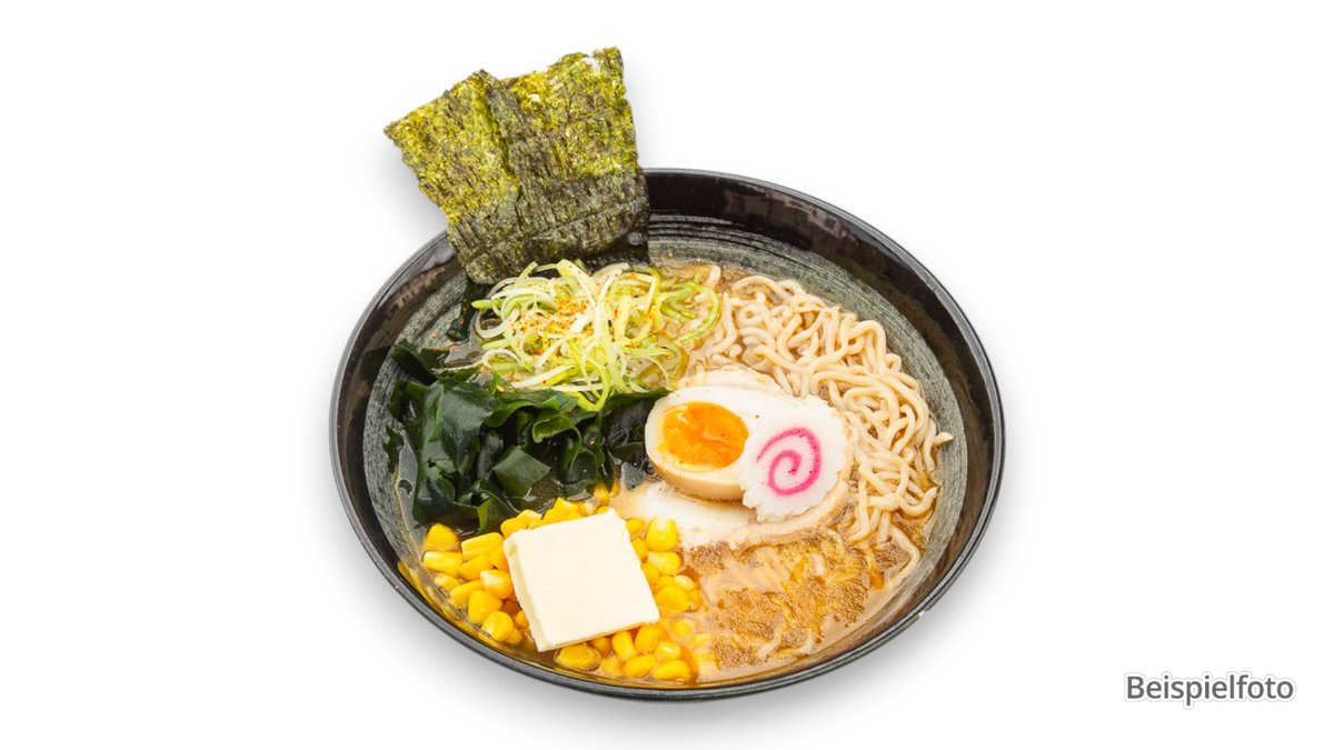 mit Sojabohnenpaste, Pak Choi, Seetang, Sojasprossen, Mais, Frühlingszwiebeln, Onsen-Ei und Naruto-Maki