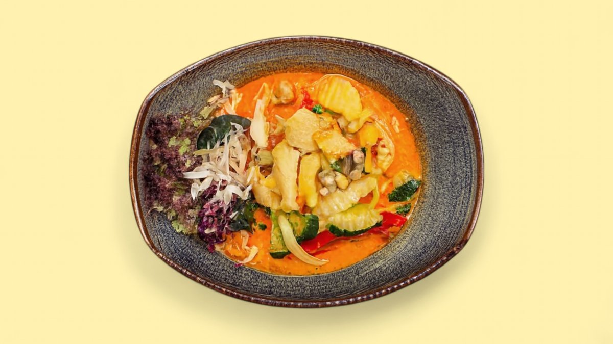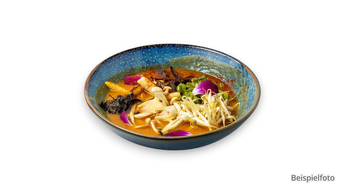 leicht scharfe Curry-Kokosmilch-Brühe mit Pak Choi, Seetang, Sojasprossen, Mais, Frühlingszwiebeln, Onsen-Ei, Zuckerschoten und Basilikum
