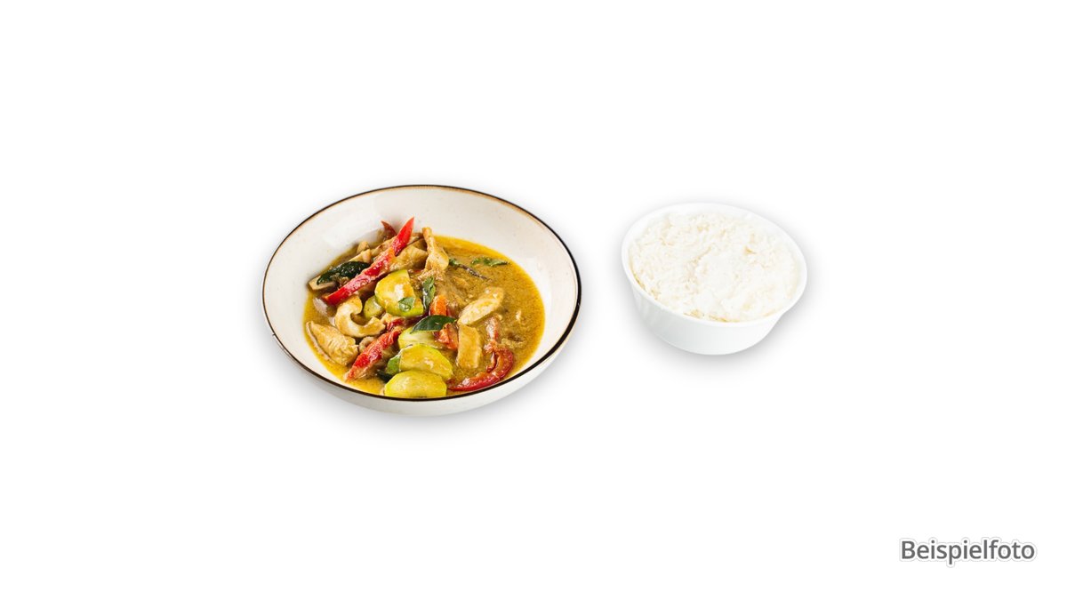mit roter Kokos-Curry-Soße, Gemüse und Reis