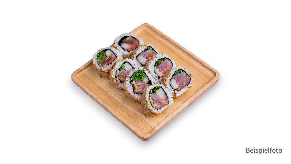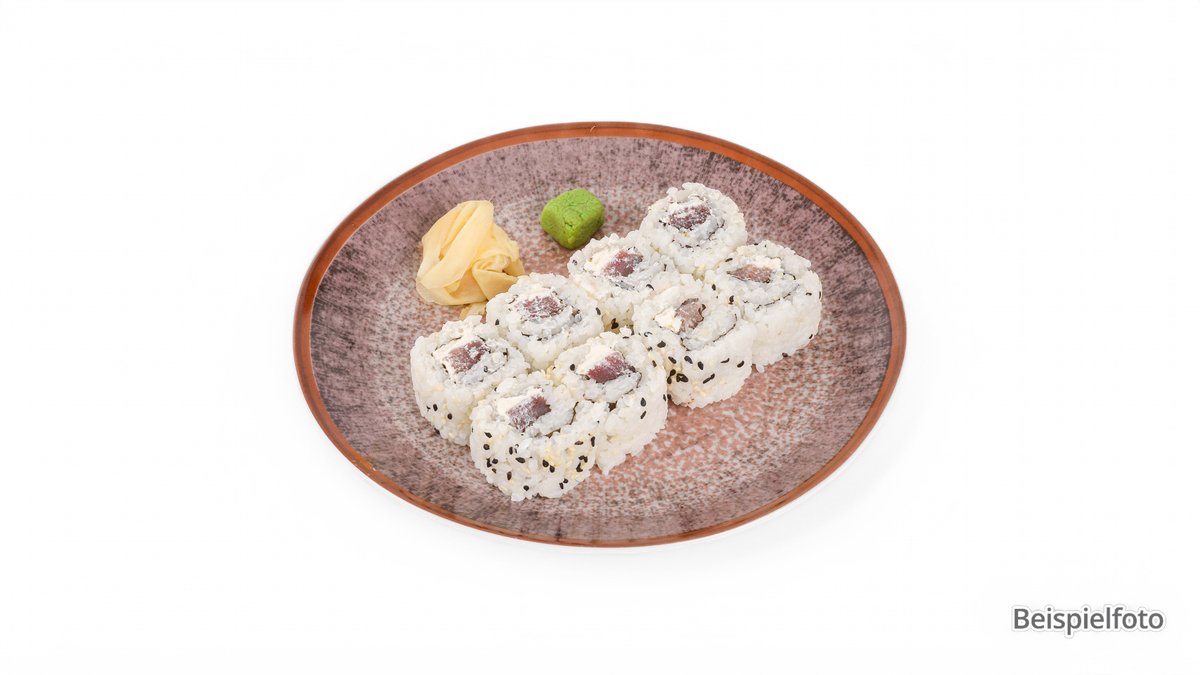 mit Thunfisch, Spargel, Rucola, Frischkäse, Tobiko und Sesam