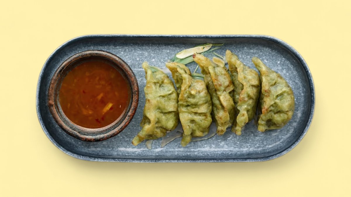 4 Stück gebackene Teigtaschen mit Gemüsefüllung und Sweet Chili Sauce