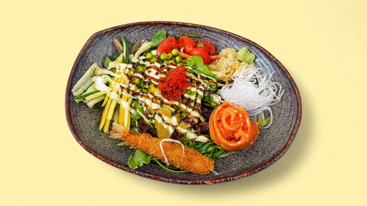 mit Sushi-Reis, Salat, Edamame, Rettich, Mango, Gurke und Seetangstreifen, dazu hausgemachtes Dressing, Unagisoße und Cocktailsoße