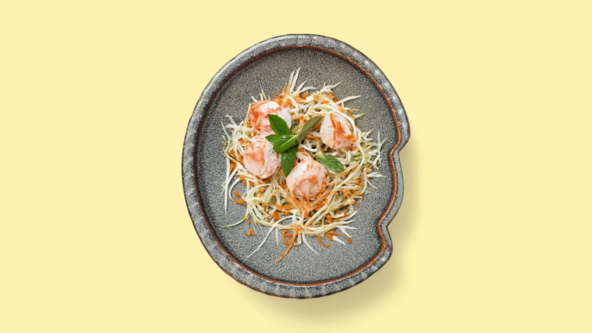 grüne Papayastreifen mit gekochten Garnelen, roten Zwiebeln, Erdnüssen, Chili, frischen Kräutern und hausgemachtem Dressing