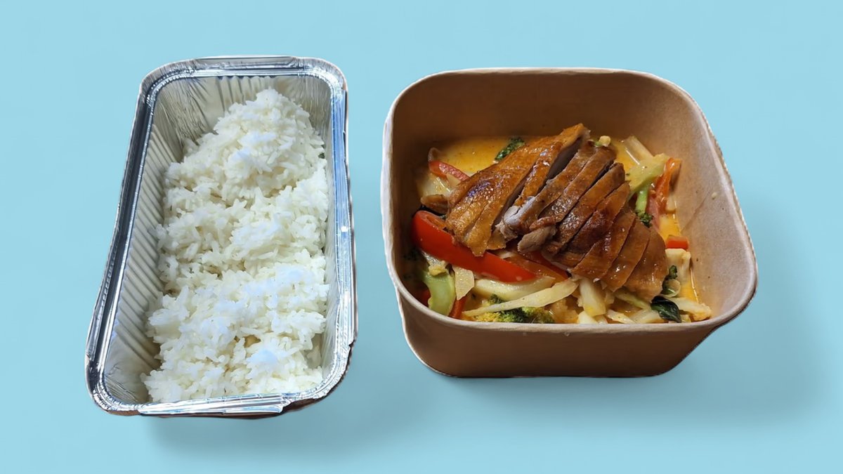 crispy fried strips of duck breast with carrots, bamboo, peppers, broccoli, cauliflower, white cabbage, Thai basil and fragrant rice in a mild curry sauce