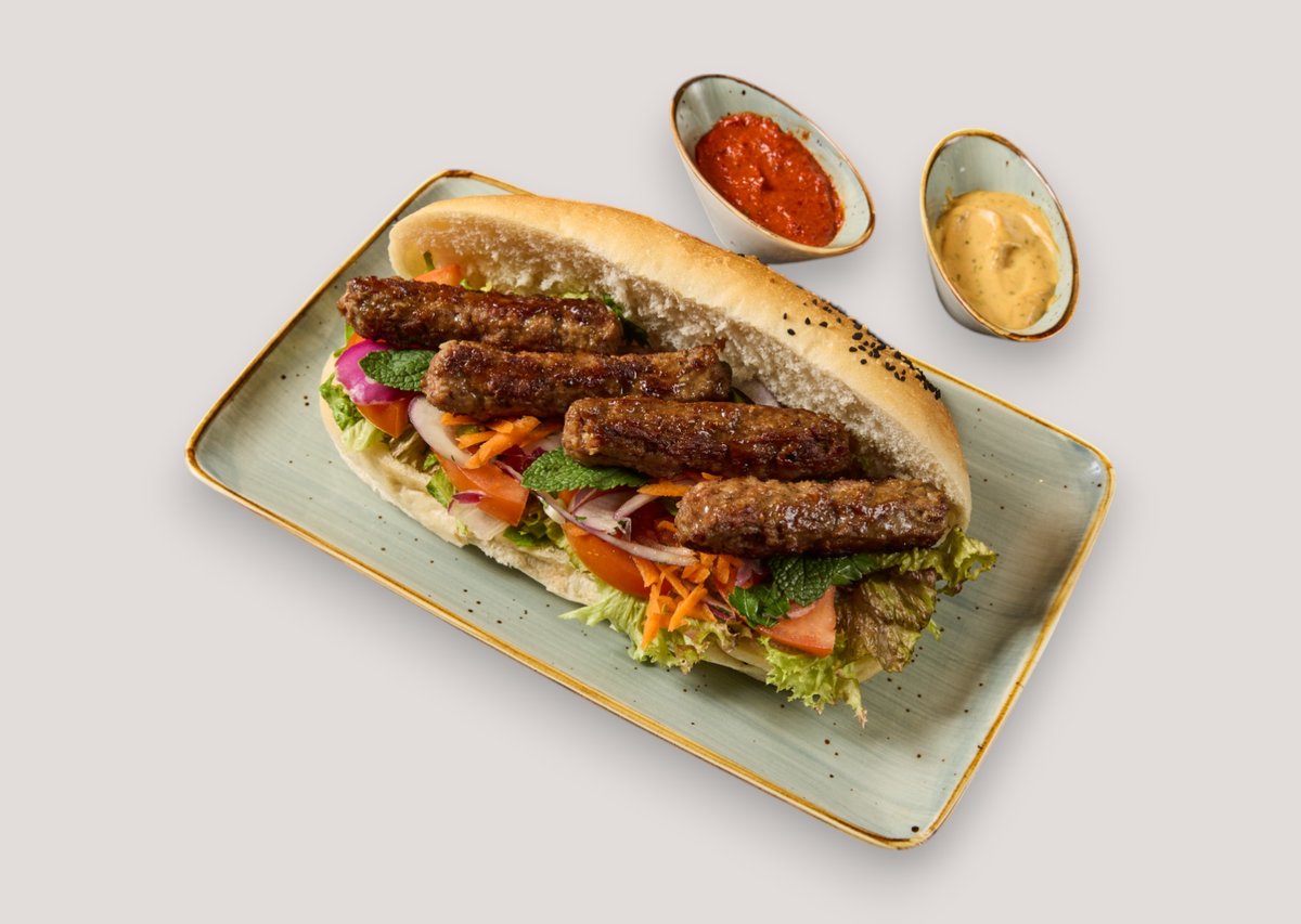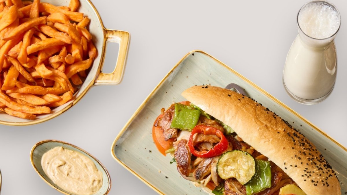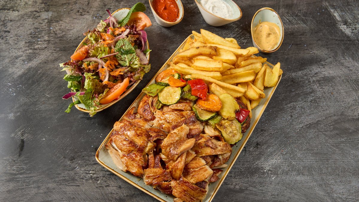 alle Gerichte werden mit Hähnchen-Drehspießfleisch, Grillgemüse, Romanasalat, Tomaten, Karotten, Minze, Zwiebel-Petersilie-Mix und hausgemachten Soßen zubereitet.
