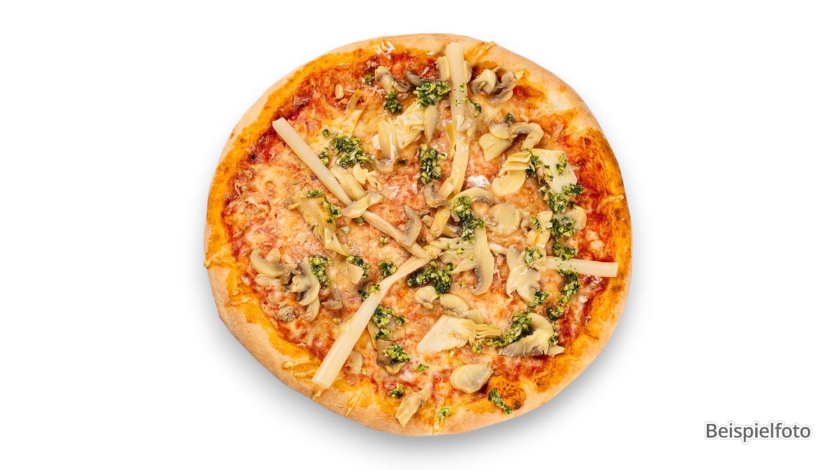 alle Pizzen werden in einer Größe deiner Wahl serviert („61. Pizza Calzone” wird in einer Größe serviert)