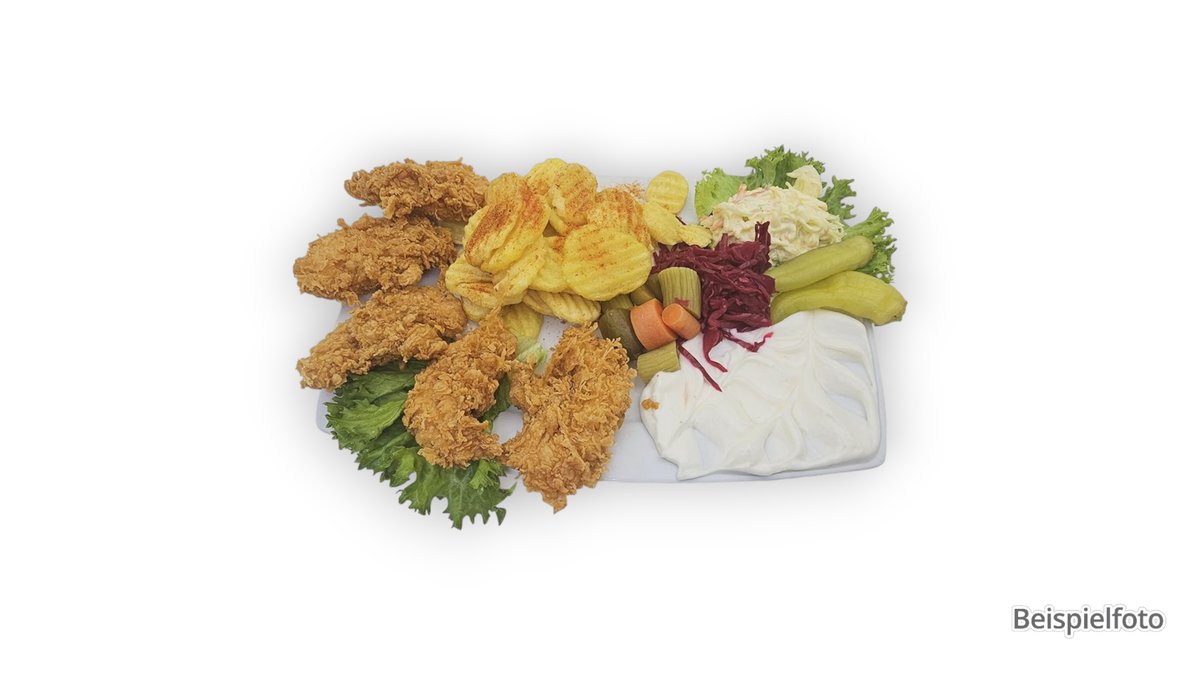 4 Speiße Hähnchenfleisch, Knoblauchsauce, Gemüse, Essiggurken, Pommes