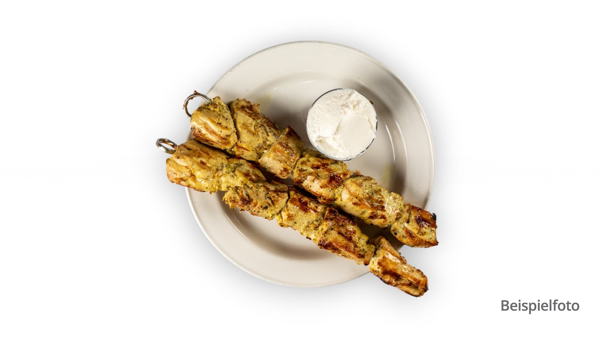 2 Spieße Hähnchenbrust, Pommes, Knoblauchsauce, Essiggurken
