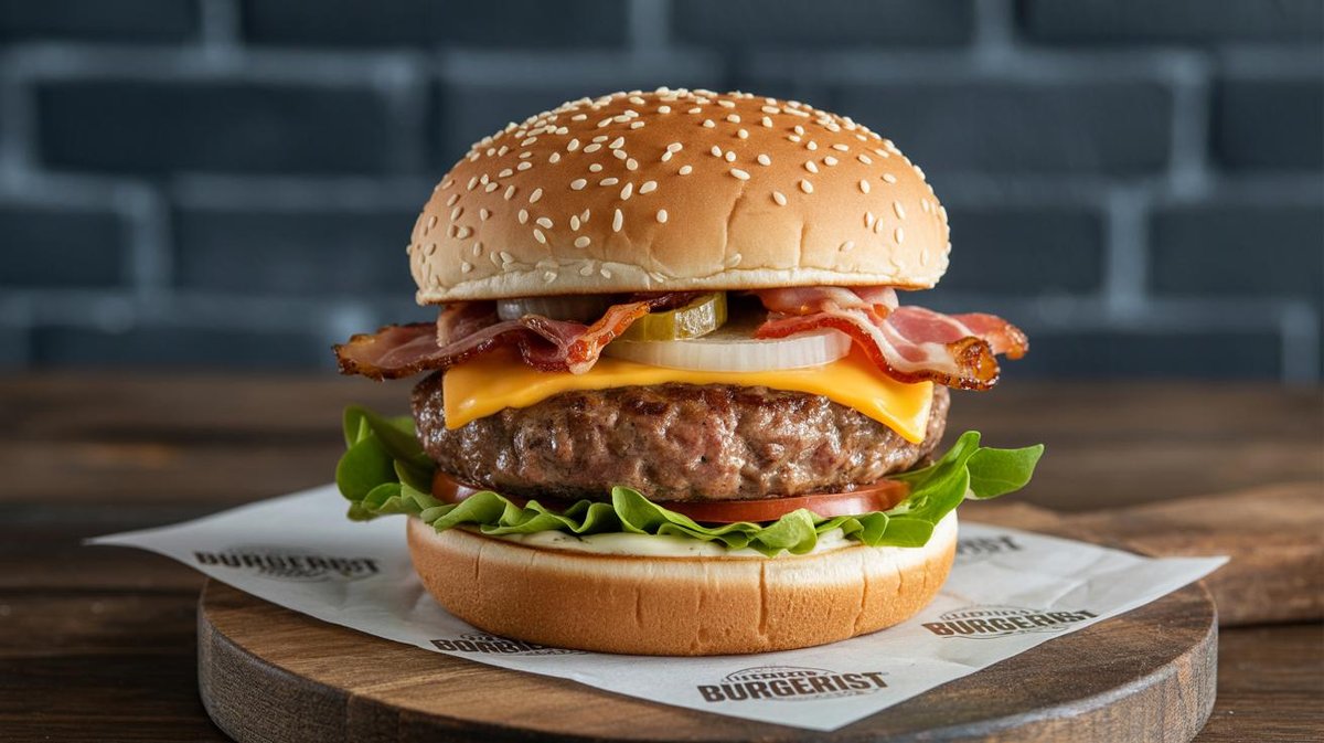 150 Gr Halal Rind Fleisch mit %100 Halal Bacon Cheddar Käse Salat Tomaten Zwiebeln und Burgerist Special Soße