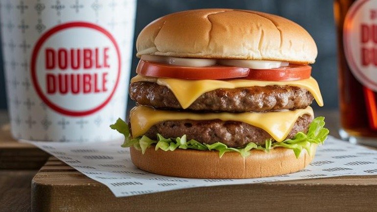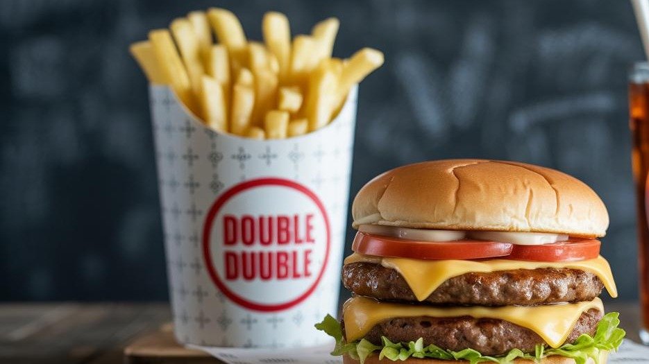 zwei Rindfleischpatties (ca. 220-240 g), Doppel-Cheddar, karamellisierte Zwiebeln und hausgemachte Soße, dazu Pommes frites & Getränke
