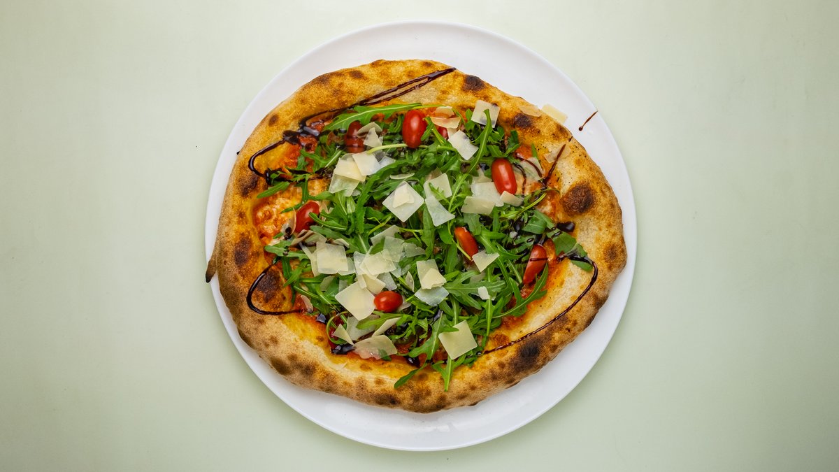 mit Avocado-Basis, Rucola, Kirschtomaten, Grana Padano DOP, Basilikum, Burrata DOP und Olivenöl