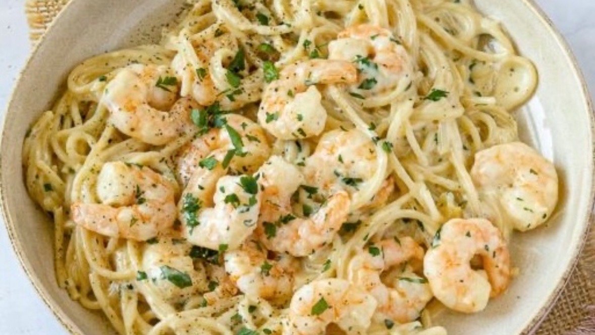 with shrimps, onions, basil, cream sauce and garlic without tomato sauce