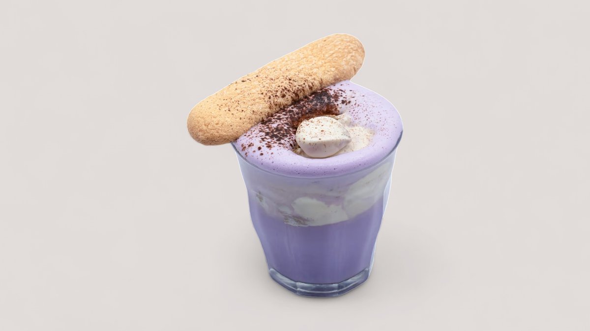 gesüßte Taromilch (asiatische Wasserwurzel-Knolle mit süß-nussigem Geschmack) hausgemachtem alkoholfreiem, entkofeiniertem,glutenfreiem Tiramisu-Topping