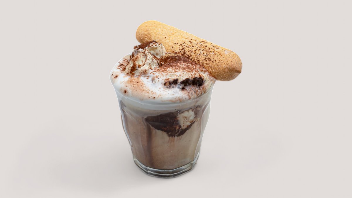 Espresso Shot, Milch, hausgemachtem alkoholfreiem, entkofeiniertem,glutenfreiem Tiramisu-Topping