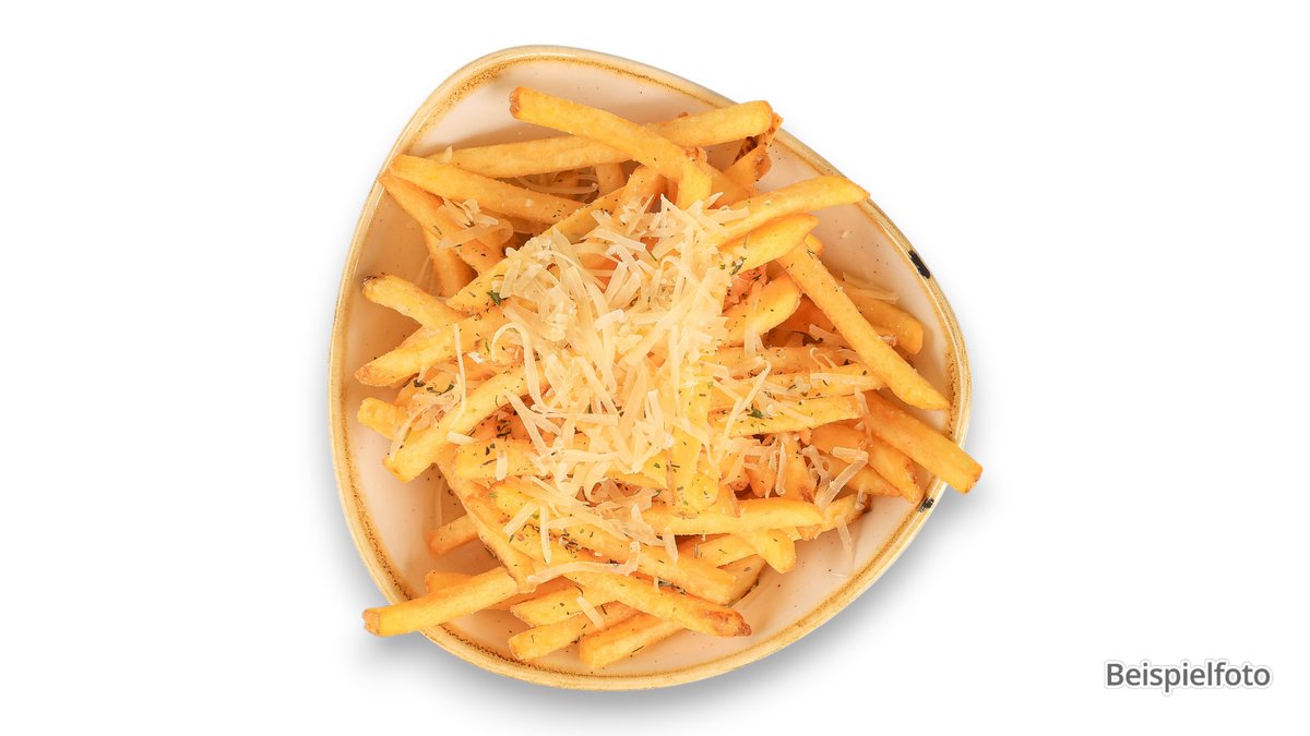 Pommes frites mit Speck vom Schwein und Käsesoße