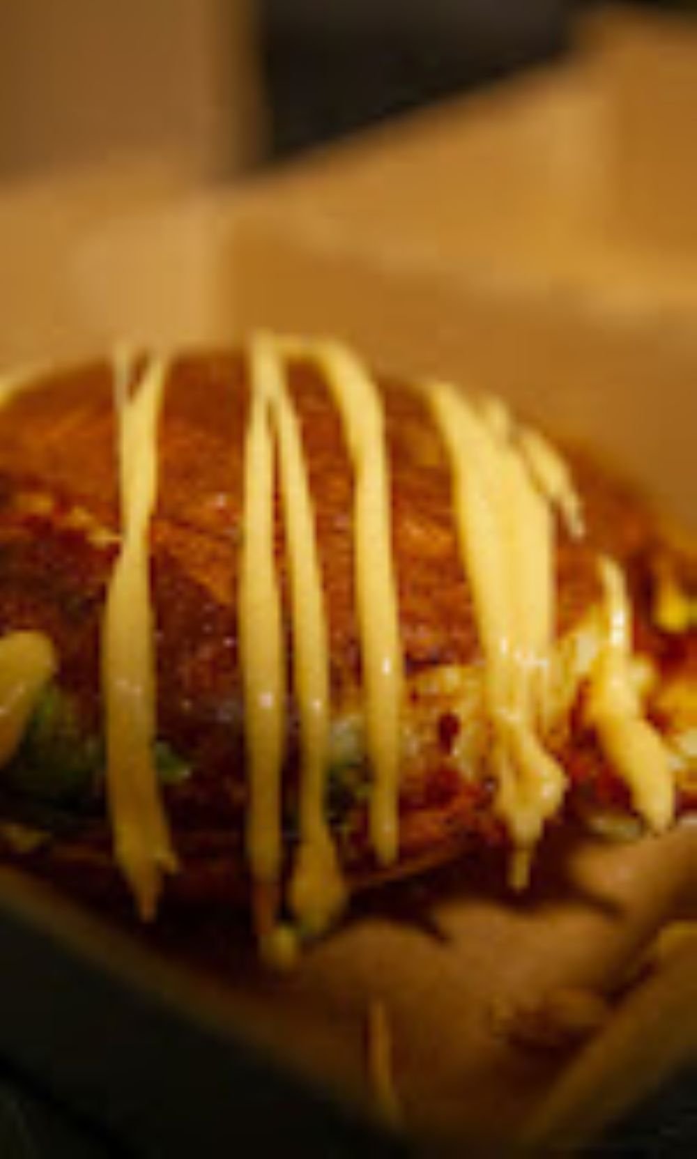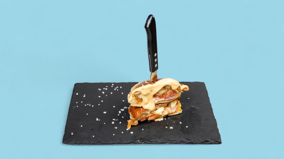 mit Kalbfleisch, Ei, Rucola, Cheddar, Parmesan, Tartar-Soße und Knoblauchsoße