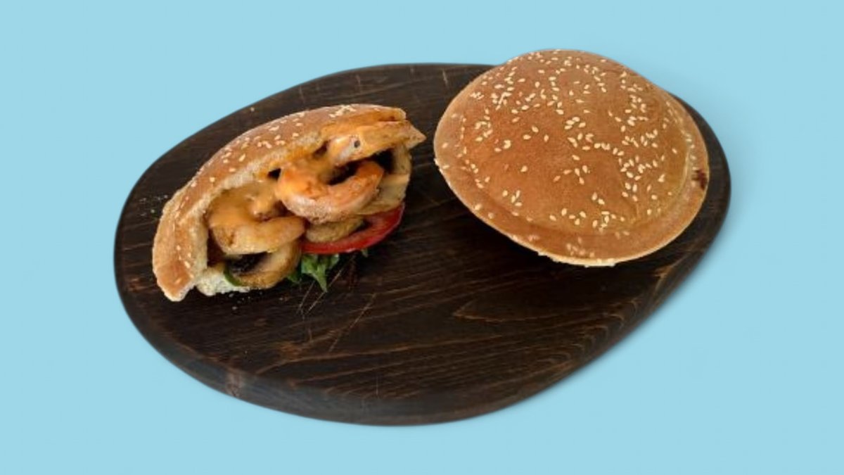 mit Hähnchen-Patty, Tomaten, Mais, Cheddar und Burgersoße