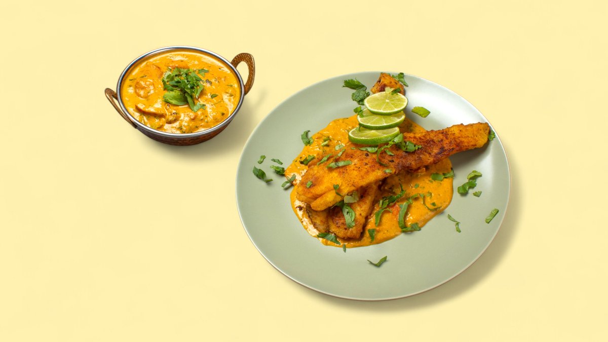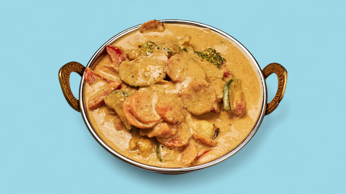 fried vegetables with fresh mango pieces in a creamy curry sauce