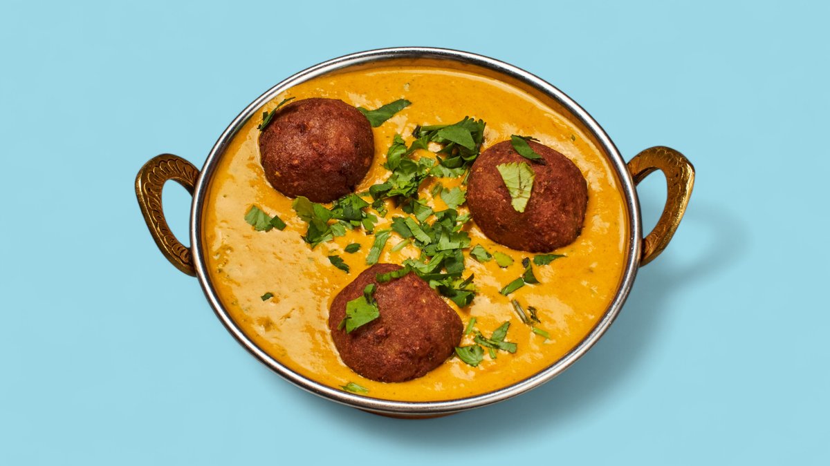 fried vegetable balls made from cauliflower, almonds and potatoes in a herb cream curry sauce