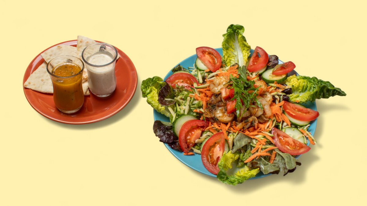 with marinated prawns, honey and soy sauce on mixed leaf salad