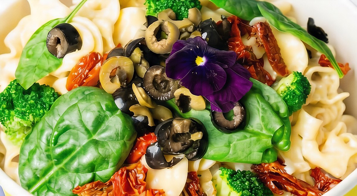 with broccoli, spinach, dried tomatoes and olives