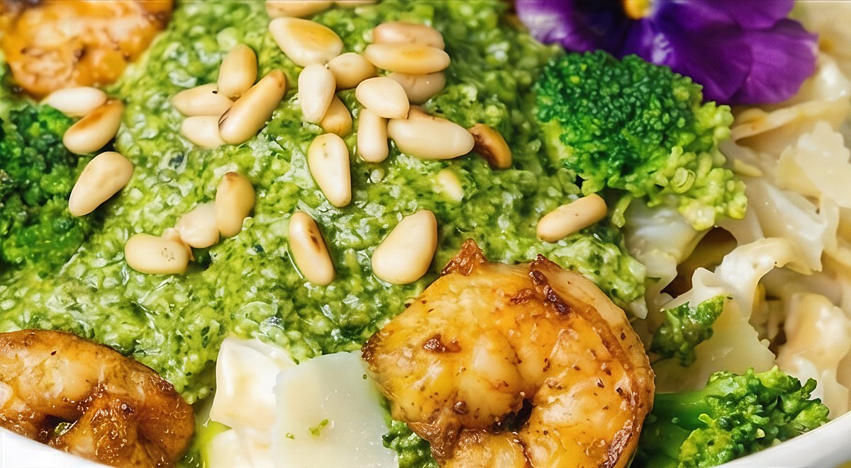 with prawns, broccoli, pesto and pine nuts