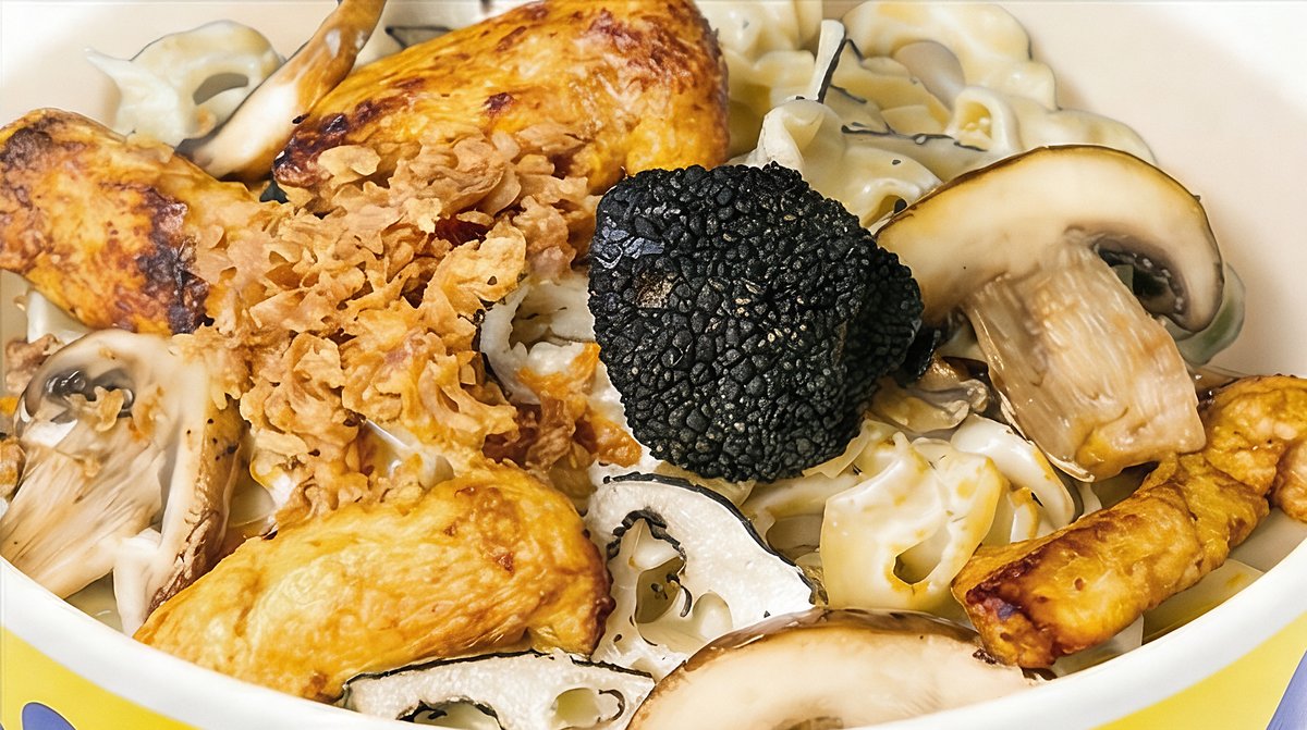 with chicken, truffles, champignons and fried onions