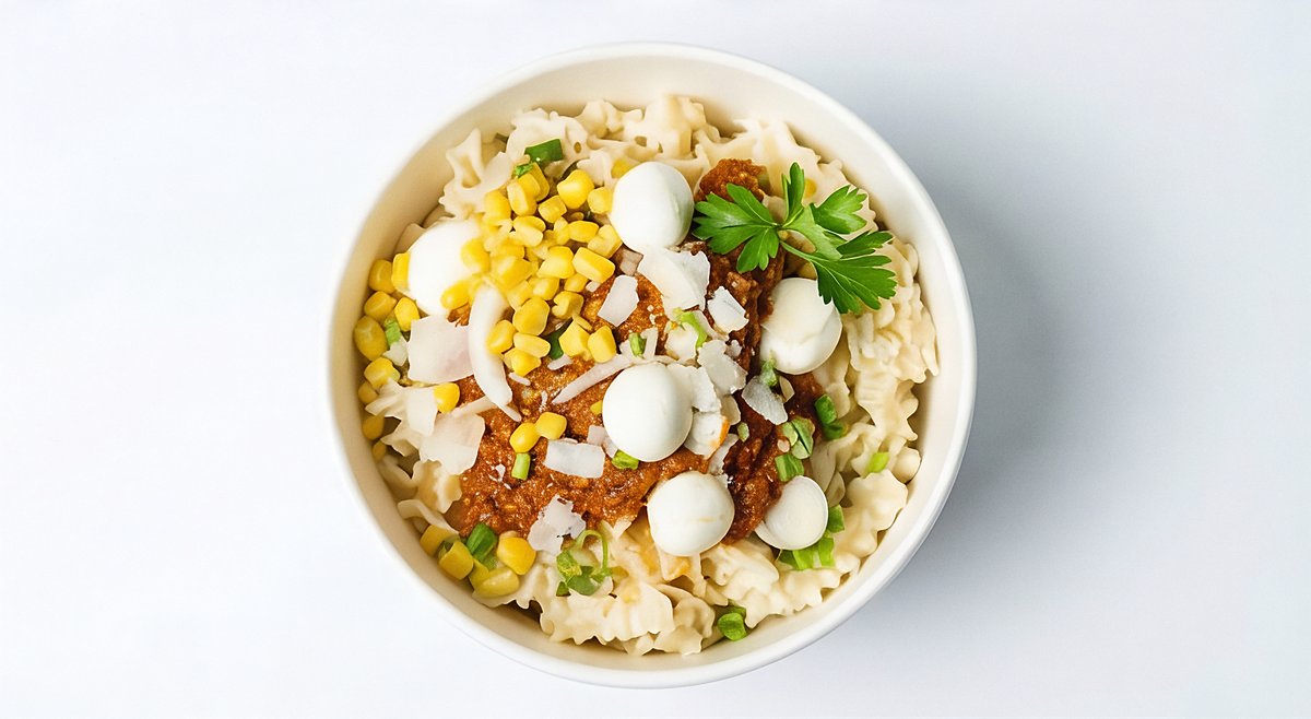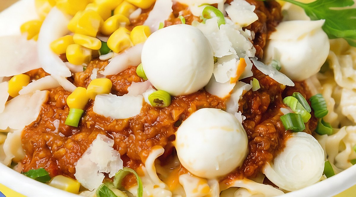with beef Bolognese, corn, mini mozzarella and spring onions