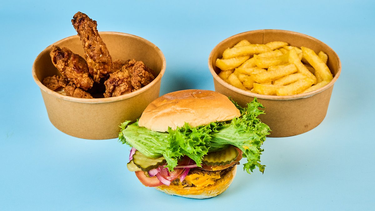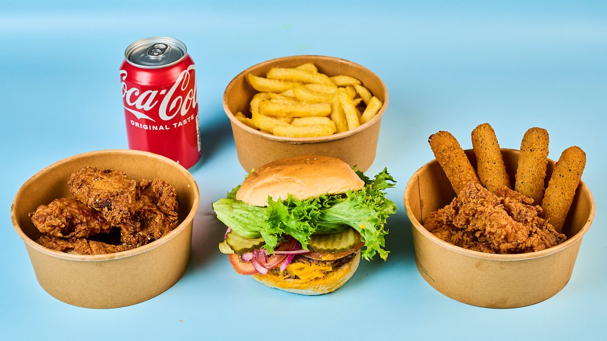 1x cheeseburger 5x hot wings (freshly breaded) 5x chicken fingers (freshly breaded) 5x mozzarella sticks 1x portion of mc cheese fries 1x 1.0l drink of your choice