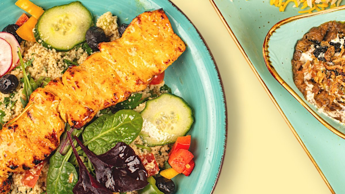 a marinated chicken breast fillet on a skewer on a lentil couscous salad
