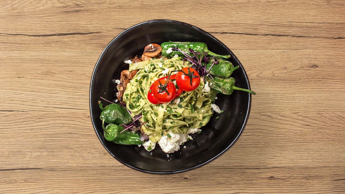 Bandnudeln in Kräuterpesto mit Zucchini, Avocado, Pimientos de Padron, Pilzen und Schafskäse