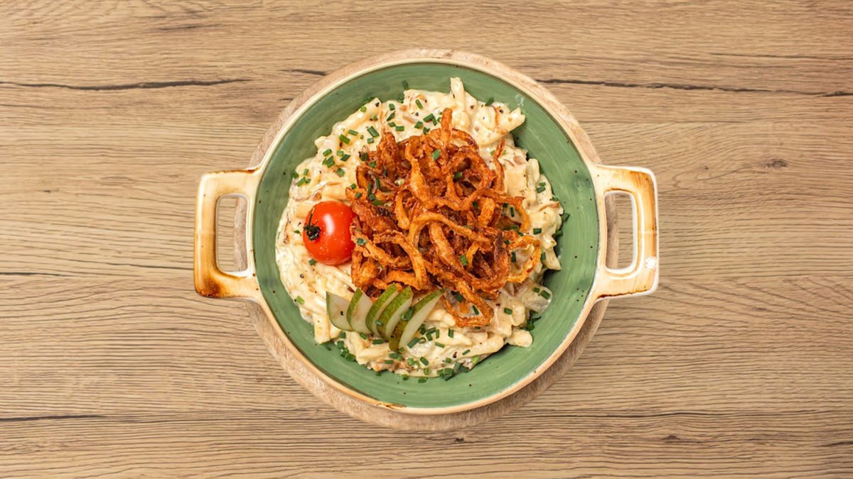 traditionelle schwäbische Käsespätzle, kombiniert mit geschmolzenem Gouda und Appenzeller, verfeinert mit süßen Birnenwürfeln und knusprigen Röstzwiebeln