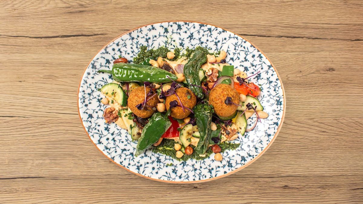 mit selbstgemachter Falafel, Grillgemüse, Pimientos de Padron, gemischten Nüssen und veganem Kräuterpesto