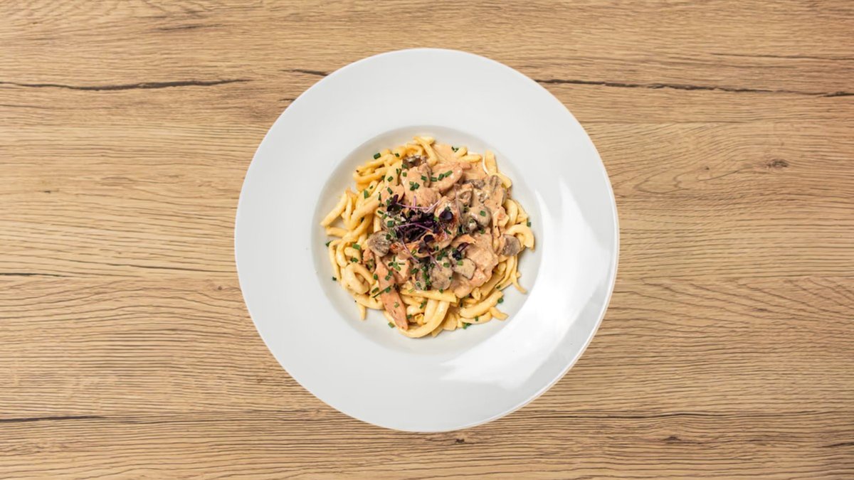 Hähnchenbrust mit frischen Champignons in Rahm, serviert mit Butterspätzle