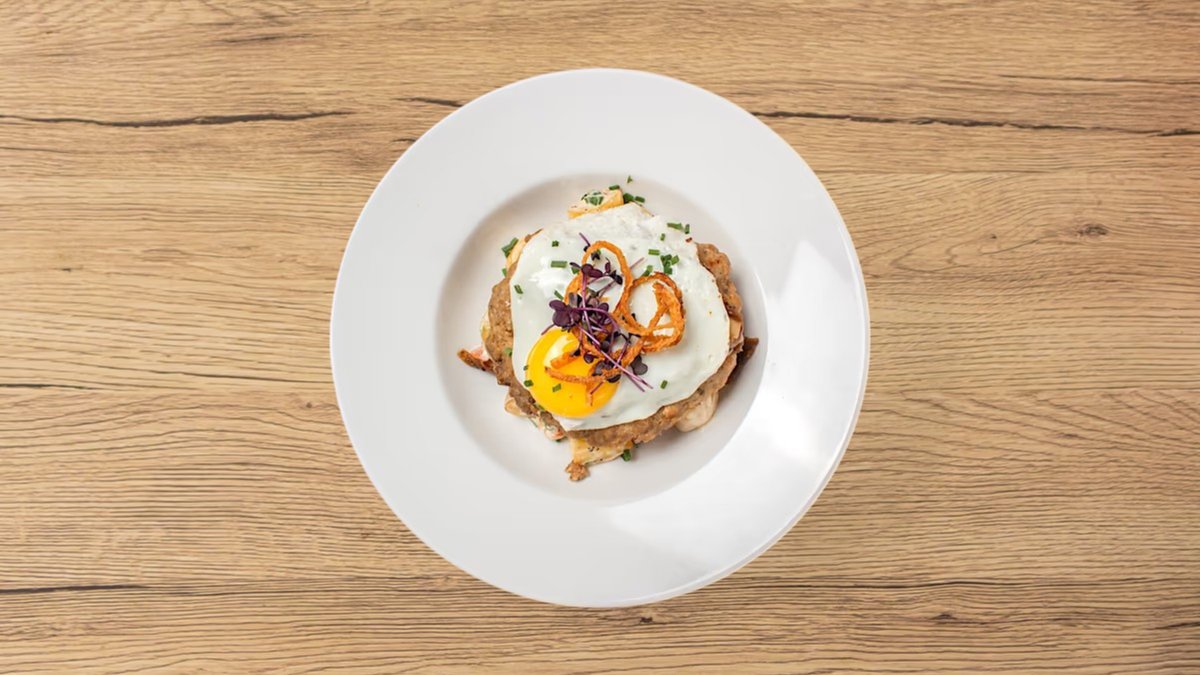 mit Schmorzwiebeln, Spiegelei, Senf und Rahmkartoffeln