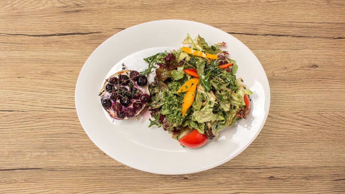mit einer leckeren Haube aus frischen Blaubeeren, Thymian und Honig an großem Salat
