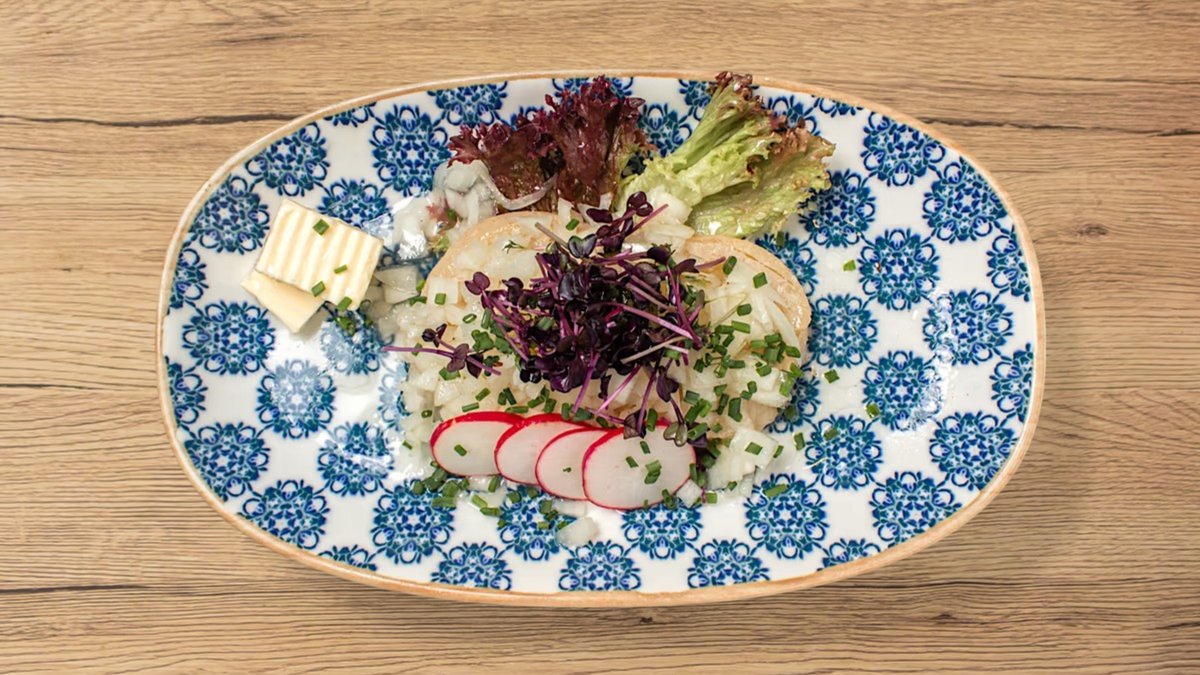 eingelegt in Roter Beete mit Apfel, Zwiebel, Schmand und Kresse, dazu Bauernbrot