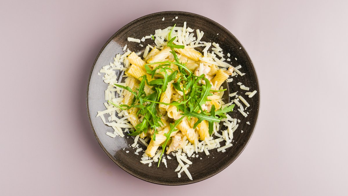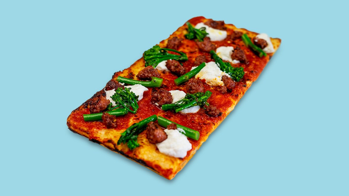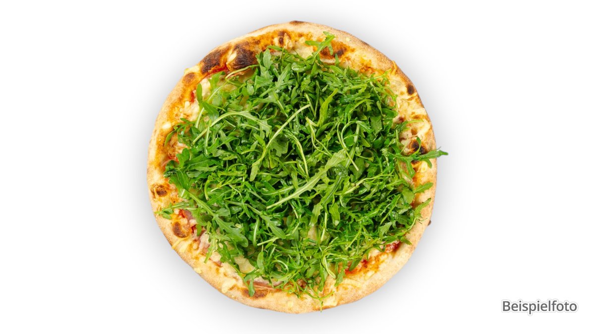 with rocket, balsamic cream, Parmesan, tomato sauce and cheese