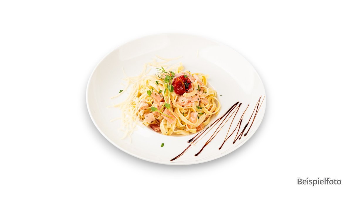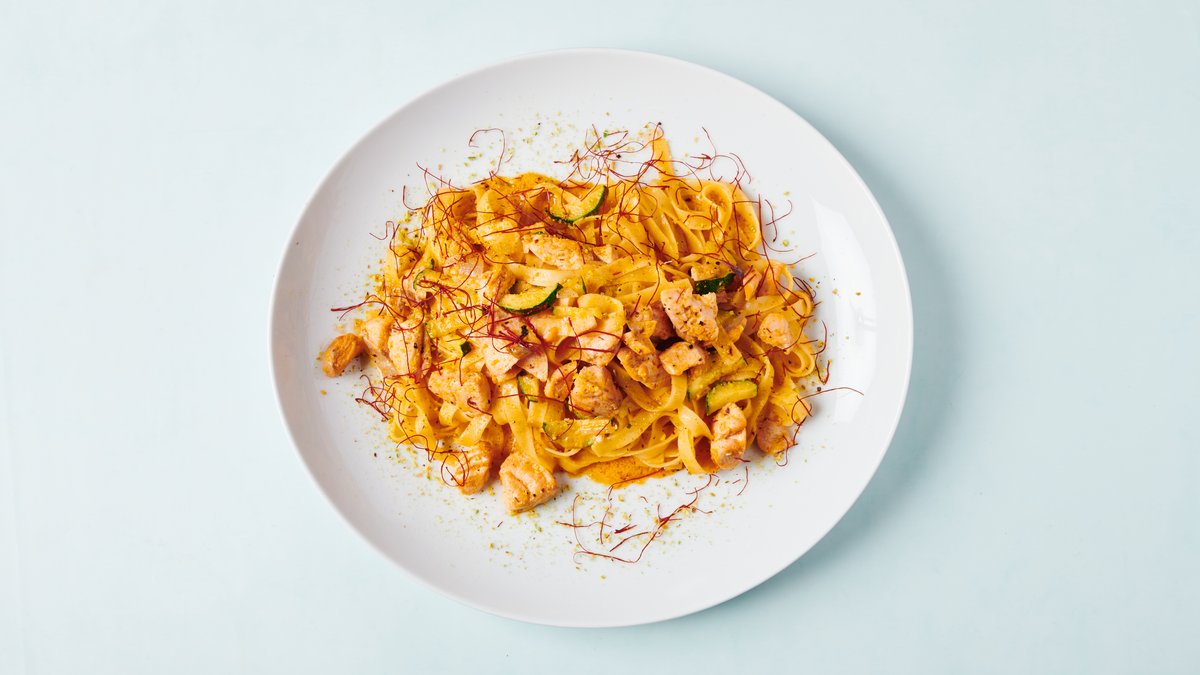 with gamba prawns, salmon, zucchini and garlic cream sauce