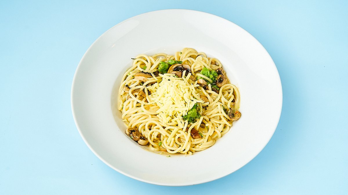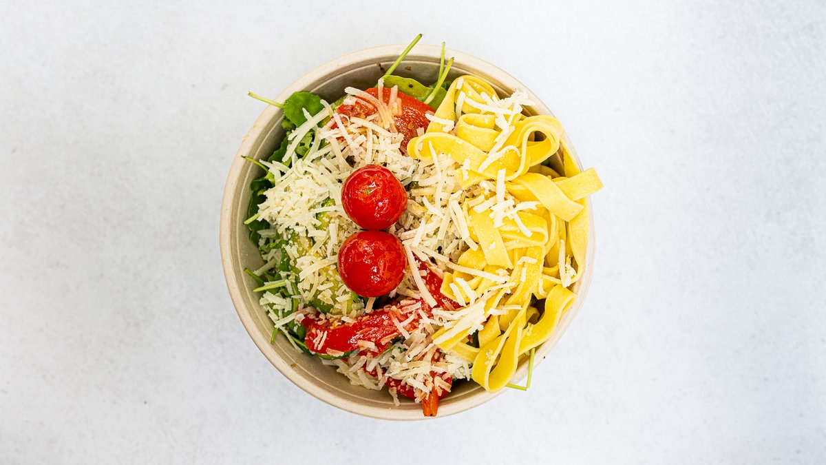 with garlic, cherry tomatoes, spicy chili peppers, Parmesan and cold pressed olive oil