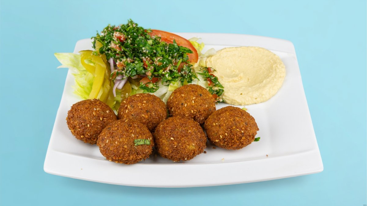 6x frisch frittierte Kichererbsenkugeln mit Tomaten, Hummus und Tabbouleh