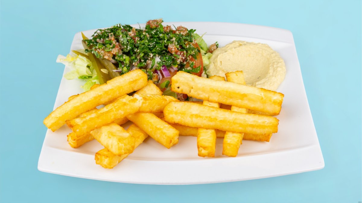 frisch frittierte Halloumisticks mit Tomaten, Hummus und Tabbouleh