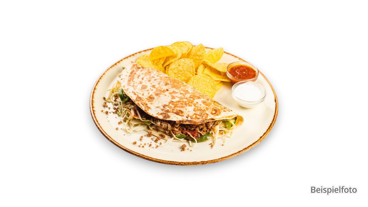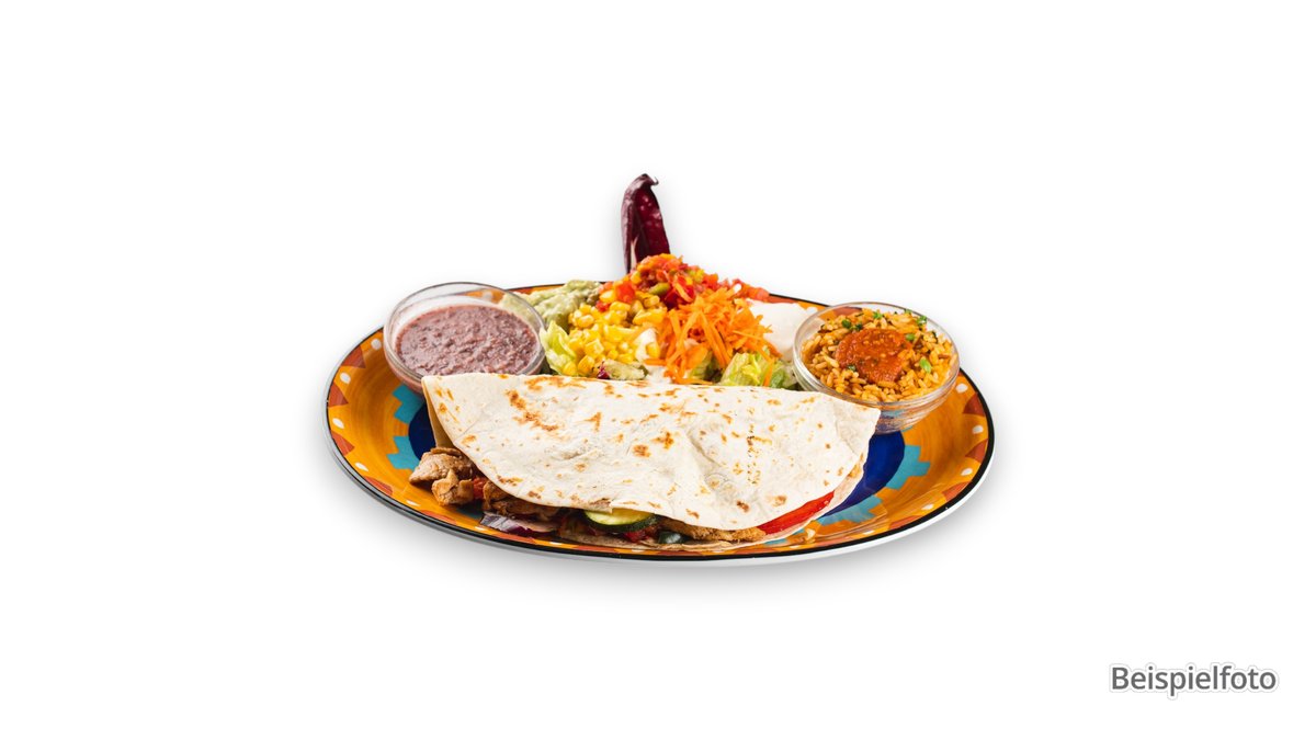 all dishes are prepared with large baked wheat tortillas, freshly roasted vegetables, Cheddar cheese, kidney beans and salsa sauce