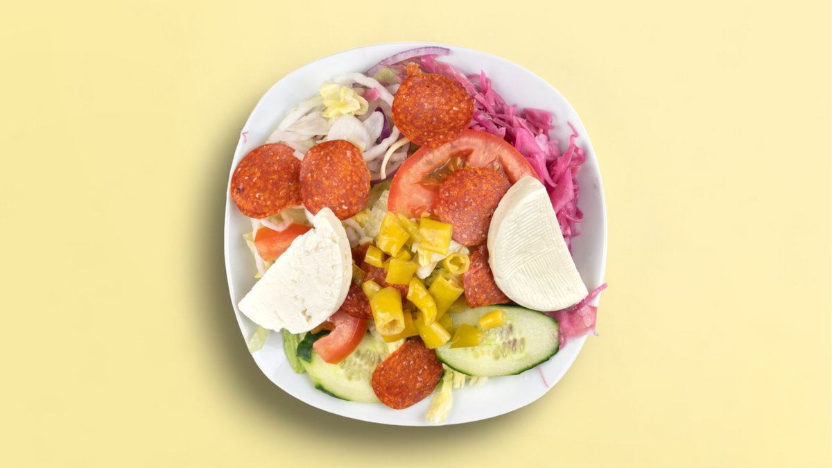alle Salate werden mit Eisbergsalat, Krautsalat, Zwiebeln und Oliven zubereitet und mit hausgemachtem Brot und einem Dressing deiner Wahl serviert